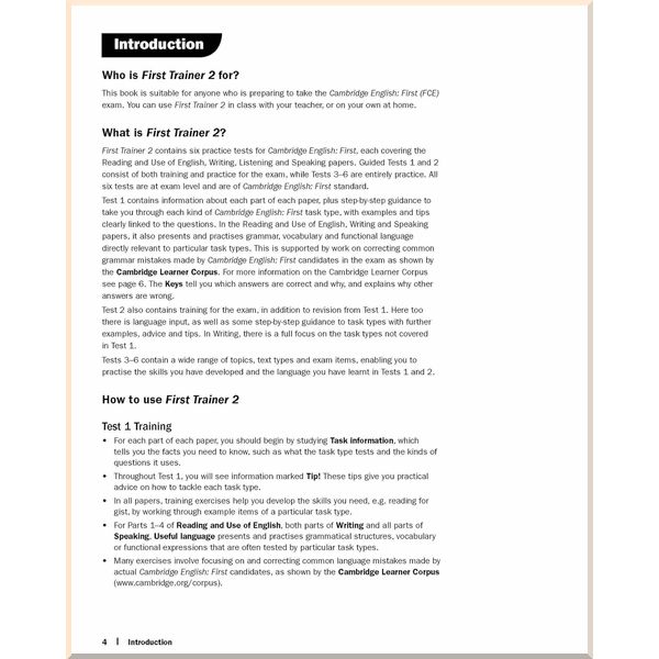 Шесть полноценных тренировочных тестов, простой в использовании экспертный справочник и советы по прохождению экзамена, которые гарантируют успех и достижение высоких результатов. Сборник тестов First Trainer 2 с ответами ко всем заданиям, заметками для учителей и доступом к аудиофайлам прекрасно подходит для подготовки к сдаче экзаменационного тестирования Cambridge English: First. Первые два теста сопровождаются советами и рекомендациями о каждой части экзамена. Дополнительные задания, взятые из реальных работ студентов, дают возможность сконцентрироваться на тех аспектах, которые вызывают большее количество трудностей и вопросов. Раздел с ответами с пояснениями и заметками для учителей предоставляет идеи для подготовки и расширения заданий, а также примеры ответов для письменной части экзаменационного тестирования.
