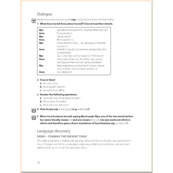 Вы хотите расширить понимание русского языка и свободно общаться на нем с другими людьми? Учебник Complete Russian позволит вам наработать необходимые навыки для использования русского языка в различных жизненных ситуациях, а также расширить культурное мировоззрение посредством аутентичных бесед, пополнения словарного запаса, изучения грамматических структур и правил, постоянному применению полученных знаний на практике и повторению пройденного материала. Чего вы сможете добиться к окончанию курса? Пройдя весь курс Complete Russian вы сможете повысить знания языка до уровня Intermediate в четырех основных навыках (чтении, письме, устной речи и восприятии языка на слух) и будете уверенно и правильно общаться с носителями языка. Подходит ли этот курсе для меня? Если вы хотите повысить уровень знаний от Beginner до Intermediate, этот курс точно предназначен для вас. Он идеально подходит для самостоятельного обучения, для индивидуальных занятий с репетитором или для занятий в группе уровня Intermediate. Данный курс также может быть использован в качестве ресурса для повышения квалификации. Что я получаю? 25 учебных разделов, справочник глаголов, глоссарий и раздел для повторения материала метод обнаружения: узнайте о правилах и моделях, которые помогут осваивать язык обучение базовым навыкам: чтению, письму, восприятию языка на слух и устной речи учитесь тому, как учиться: советы и навыки, которые помогут стать хорошим студентом культурные заметки: узнавайте о людях и местах России обучение, ориентированное на результат: учащиеся ставят конкретные цели в процессе обучения аутентичные задания для аудирования: примеры реальных разговоров дают представление о речи носителей языка проверяйте собственные знания благодаря специальному разделу