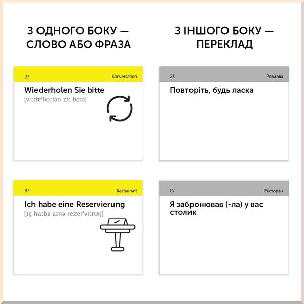 Набор «Alltäglich Deutsch» — карточки с фразами на каждый день, предназначены для повышения уровня владения немецким. Для тех, кто только начинает изучать немецкий язык, но уже хочет уметь вести обыкновенный разговор. 105 карточек с вопросами и популярными фразами помогут чувствовать себя увереннее во время обыденного разговора и путешествия за границу. К каждой карточке есть аудиосопровождение, которое дополнительно научит разбираться с правильным произношением и восприятием слов на слух. Каждый набор содержит: 105 карточек, два разделителя «Знаю» и «Не знаю», упрощенную версию коробки для интервального повторения.